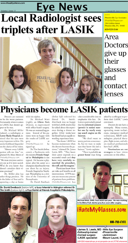 Philadelphia / Bucks County LASIK Surgeon - Dr. James S. Lewis Eye News Volume I Issue 15 Volume I Issue 15 Originally published, April 15, 2001 Local Radiologist sees triplets after LASIK Physicians become LASIK patients Doctors are rumored to be the worst patients. Fortunately, when it comes to LASIK that doesn’t appear to be true. Dr. …