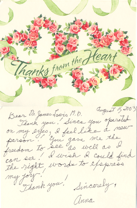 Thank you! Since you operated on my eyes, I feel like a new person! You gave me the freedom to see as well as I can see! I wish could find the right words to express my joy!