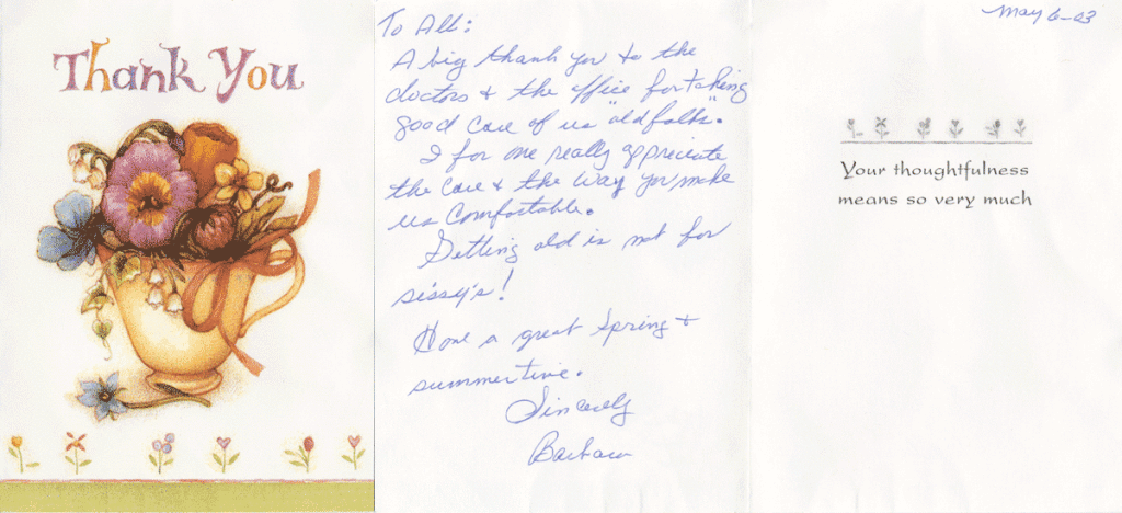 A big thank you to the doctors and the office for taking good care of us “old folks”.