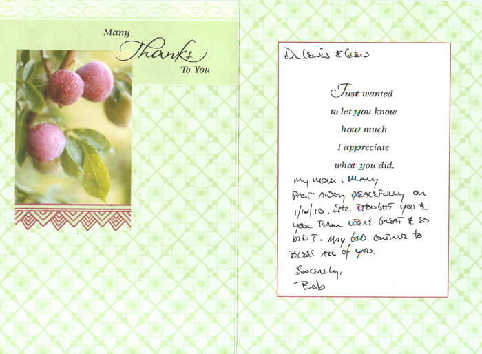 My Mom, Mary past away peacefully on 1/12/10. She thought you & your team were great & so did I. May God continue to bless all of you.