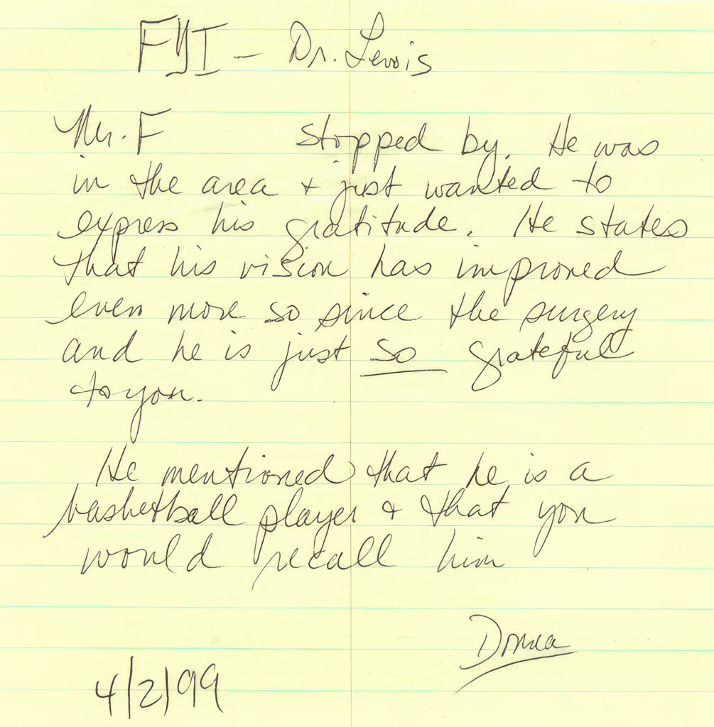 Mr. F___ stopped by. He was in the area and just wanted to express his gratitude. He states that his vision has improved even more so since the surgery and he is just so grateful to you.