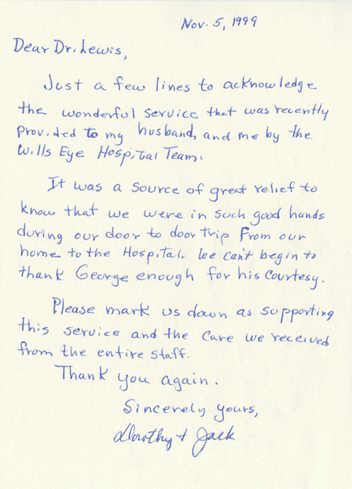 Just a few lines to acknowledge the wonderful service that was recently provided to my husband, and me by the Wills Eye Hospital Team.