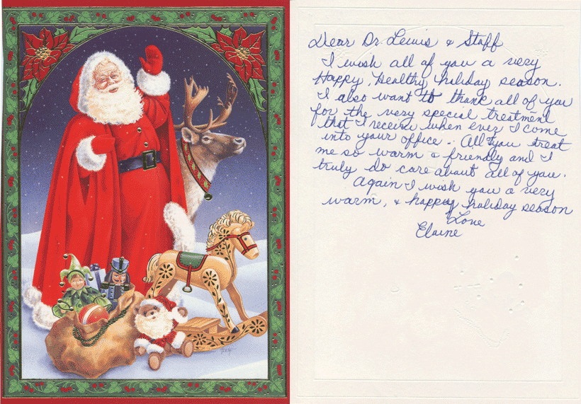 I wish all of you a very happy, healthy holiday season. I also want to thank all of you for the very special treatment that I received when ever I came into your office.