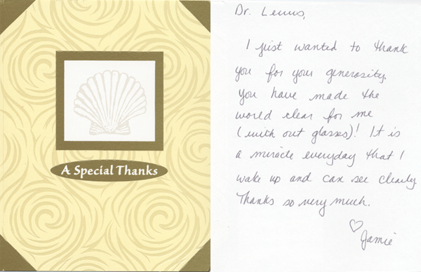 I just wanted to thank you for your generosity. You have made the world clear for me (without glasses)! It is a miracle everyday that I wake up and can see clearly.