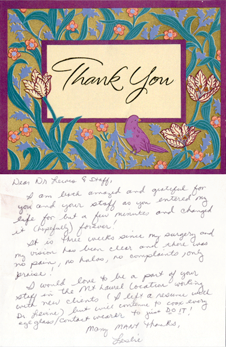 I am both amazed and grateful for you and your staff as you entered my life for but a few minutes and changed it (hopefully) forever! It is three weeks since my surgery and my vision has been clear and there was no pain, no halos, no complaints, only praise! I would love to be a part of your staff in the Mt. Laurel location working with new clients (I left a resume with Dr. Levine) but will continue to coax every eye glass/contact wearer to just DO IT!