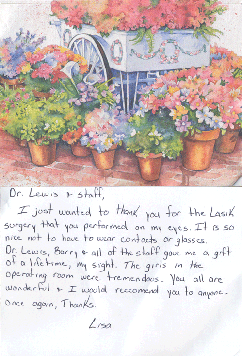I just wanted to thank you for the LASIK surgery that you performed on my eye. It is so nice not to have to wear contacts or glasses. Dr Lewis, Barry and all of the staff gave me a gift of a lifetime, my sight. The girls in the operating room were tremendous. You all are wonderful and I would recommend you to anyone.
