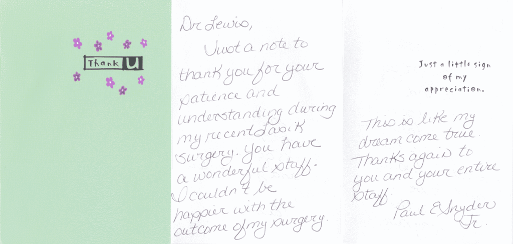 Just a note to thank you for your patience and understanding during my recent LASIK surgery. You have a wonderful staff. I couldn’t be happier with the outcome of my surgery.This is like my dream come true. Thanks again to you and your entire Staff.