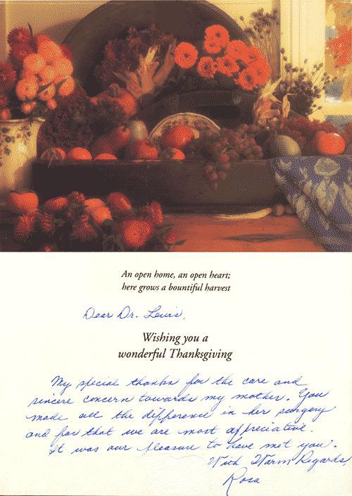 My special thanks for the care and sincere concern towards my mother. You made all the difference in her surgery and for that we are most appreciative.