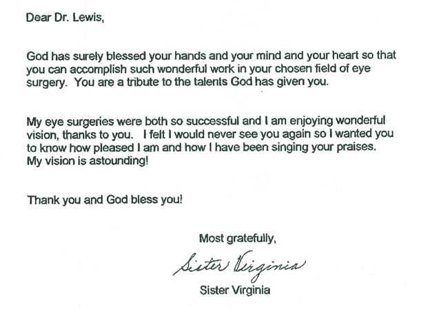 My eye surgeries were both so successful and I am enjoying wonderful vision, thanks to you. I felt I would never see you again so I wanted you to know how pleased I am and how I have been singing your praises. My vision is astounding Thank you and God bless you!