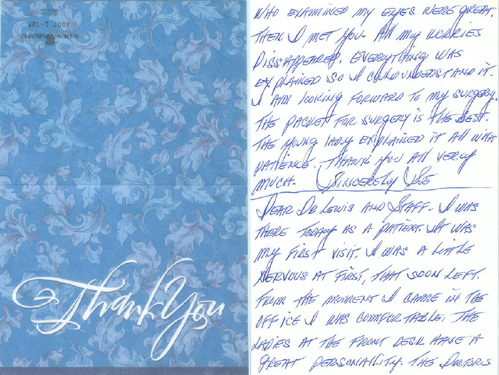 I was there today as a patient. It was my first visit. I was a little nervous at first, that soon left. From the moment I came in the office I was comfortable, the ladies at the fron desk have a great personality. The doctors who examined my eyes were great. Then I met you. All my worries disappeared. Everything was explained so I could understand it. I am looking forward to my surgery. The packet for surgery is the best. The young lady explained it all with patience. Thank you all very much.